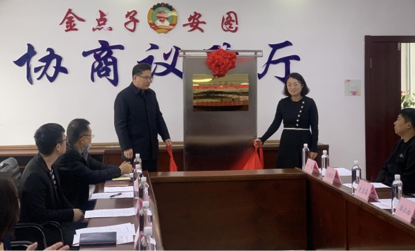 会上,县工商联主席金贞娟和县委政法委副书记于洪涛为服务中心揭牌。