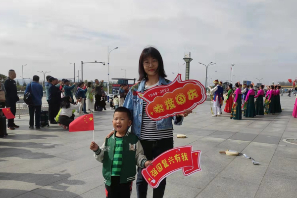 在各交通枢纽和旅游景点,游客们手持 “强国复兴有我”“我爱中国”“中秋节快乐”“欢度国庆”等标语牌,手拿着小国旗,情绪饱满地和国旗合影留念,高声齐呼“祝福祖国,生日快乐!”一张张合影,饱含着对祖国的祝福。