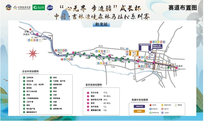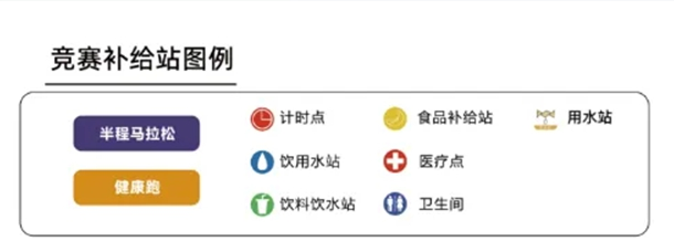 竞赛中的计时点、饮用水站、医疗站、用水站、食物补给站也一应俱全,在赛道布置图上一目了然。