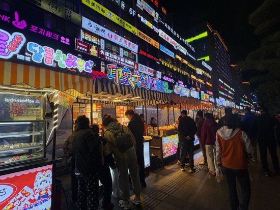 延吉网红弹幕墙下延大美食街夜市,成为市民和游客夜间新的打卡点。夜幕降临,霓虹闪烁,弹幕墙的璀璨灯光与夜市的热闹烟火交相辉映。炒米肠、酱猪蹄、炸年糕……60个餐饮摊位一字排开,一股股诱人的香气扑鼻而来,几乎每个摊位前都挤满了品尝美食的游客。不少游客一手举着滋滋冒油的烤肉串,一手举着手机,用镜头定格这热闹的景象。红火的生意,也让摊位老板高兴得合不拢嘴。