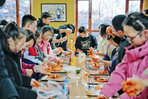 在文化体验环节,青少年们沉浸式感受特色民俗与自然魅力。在“人参科普小课堂”上,专业讲师结合头山村的生态资源,深入浅出地讲解人参的生长习性、药用价值与延边人参产业的发展历程,还带领大家走进田间地头,近距离观察人参生长状态,让知识从书本走向实践。“森山寻宝”活动则将自然探索与趣味挑战相结合,大家以小组为单位,在山林间寻找提前隐藏的“宝藏”,在欢声笑语中增进彼此了解,加深友谊。民俗美食制作环节更是充满温情,各族青少年们挽起袖子,亲手制作辣白菜与打糕,每一个步骤都凝聚着大家的专注与热情。当品尝到自己亲手制作的美食时,不同民族的学生们相互分享、交流心得,民族间的情谊在美食的香气中愈发浓厚。此外,“桦树皮画手工DIY”活动让青少年们感受到非遗的独特魅力,大家充分发挥想象力,用桦树皮制作出一幅幅充满童趣与民族特色的画作,既锻炼了动手能力,也加深了对非遗的认知。