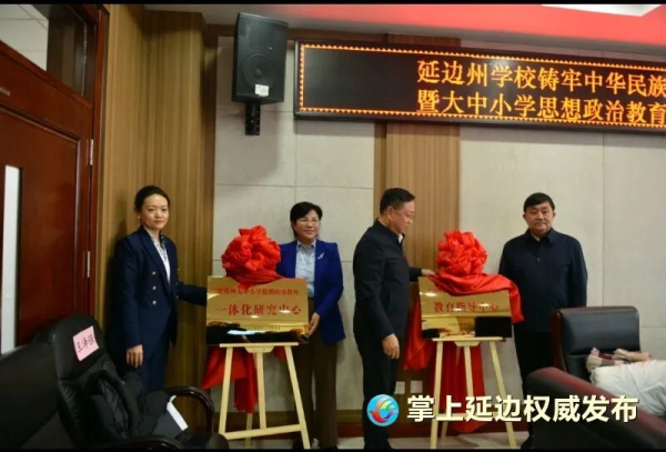 参加活动的相关领导共同为延边州学校铸牢中华民族共同体意识教育指导中心、延边州大中小学思想政治教育一体化研究中心揭牌。