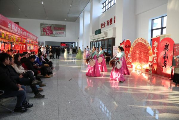 在重点车站设立民俗文化体验区,邀请非遗代表性传承人现场演示打糕制作、伽倻琴演奏;组建职工文艺轻骑兵,身着民族服饰开展230余场“快闪”表演,搭配米酒、辣白菜等特色美食分享,让候车室变身为各民族交流互动的“文化客厅”。