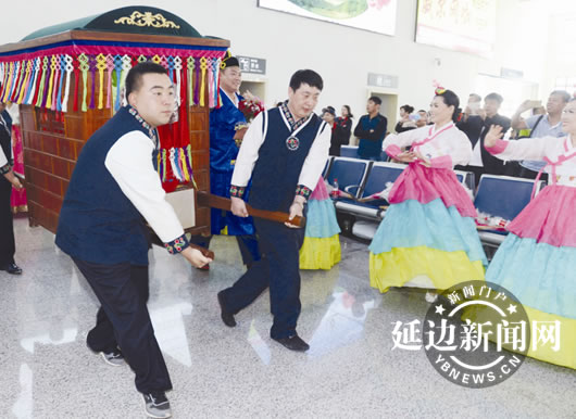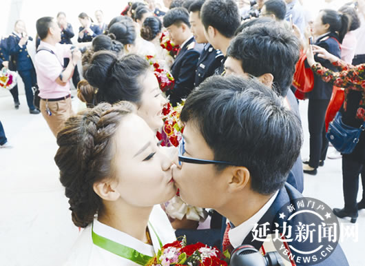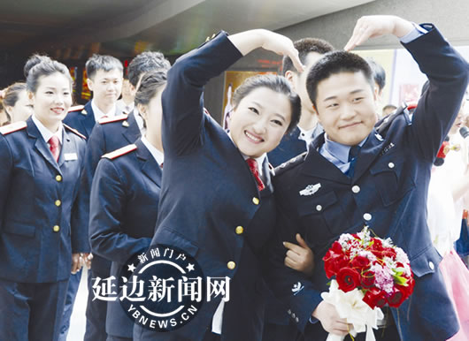 5月20日9时许,C1003、C1042次列车先后来到延吉西站,11对手牵手、穿着统一制服的高铁乘务人员成为车上最抢眼、最特殊的旅客,他们刚从图们、敦化、安图等高铁站各自的工作岗位上赶来,搭乘这趟别致的“婚车”,驶向幸福的婚礼殿堂。为了鼓励大学生扎根边疆,扎根最美高铁,延吉车务段在“520”这个美丽的日子里,为他们举行了“相约幸福延车,牵手最美高铁”首届大学生集体婚礼。