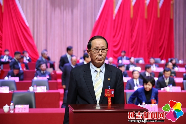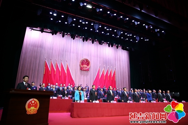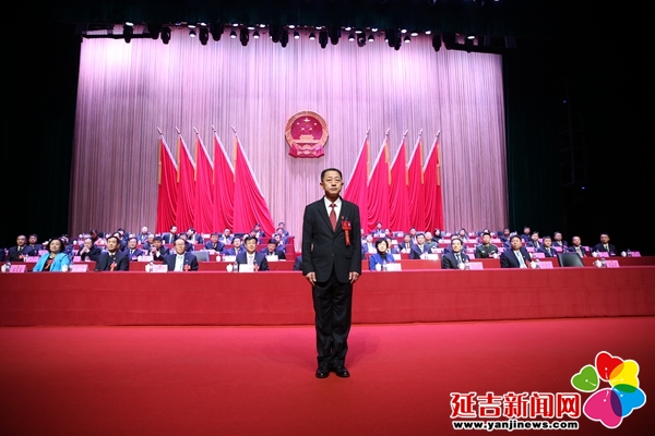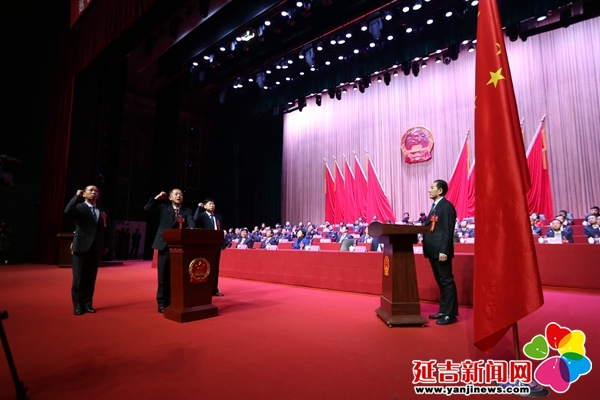 宪法宣誓 金洪石 摄 经过选举,权世荣、姜力军补选为延吉市第十八届人民代表大会常务委员会委员,暴刚当选为延吉市监察委员会主任。