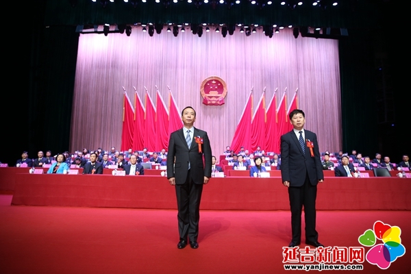 在代表们热烈的掌声中,暴刚、权世荣、姜力军上台与全体代表见面,同时进行宪法宣誓。