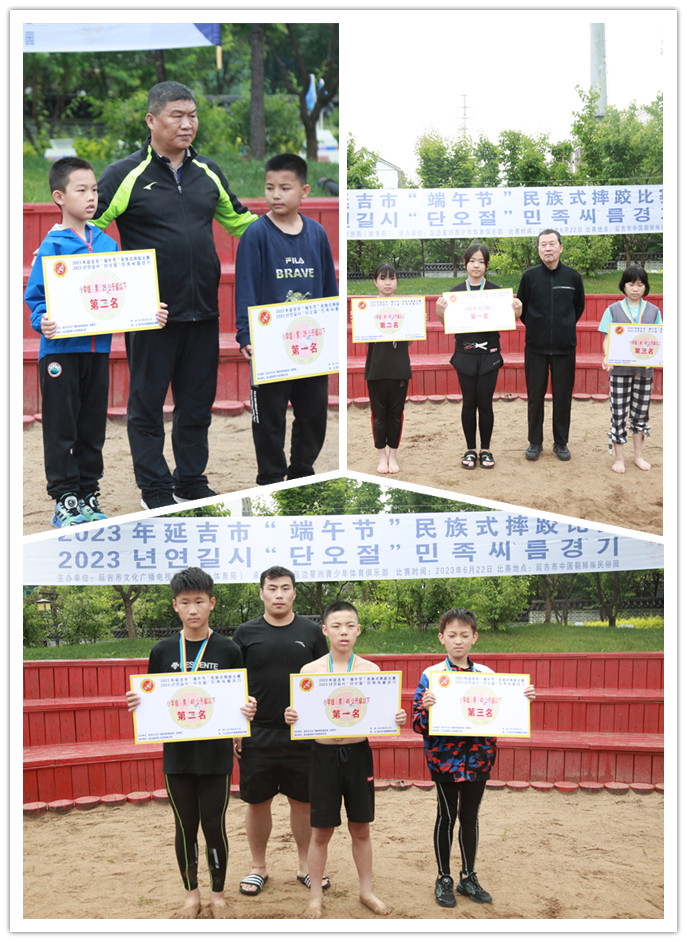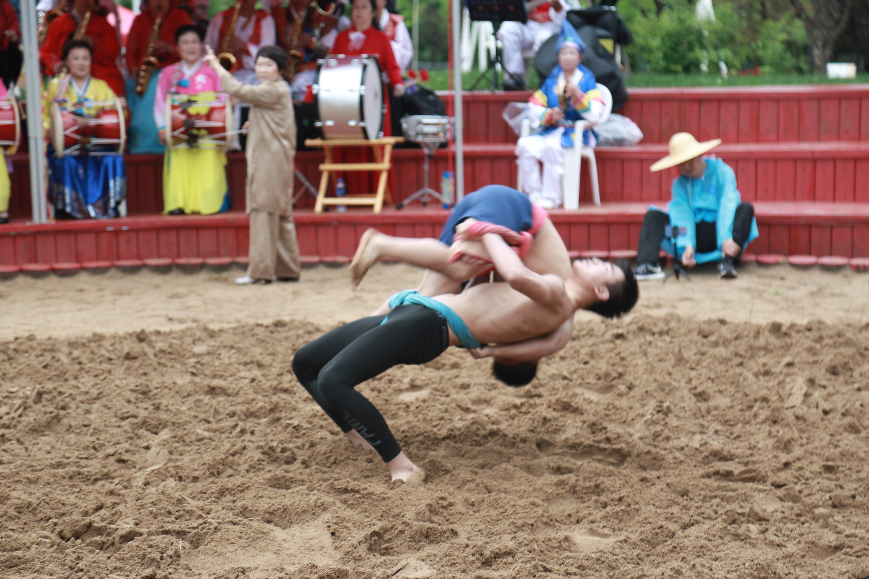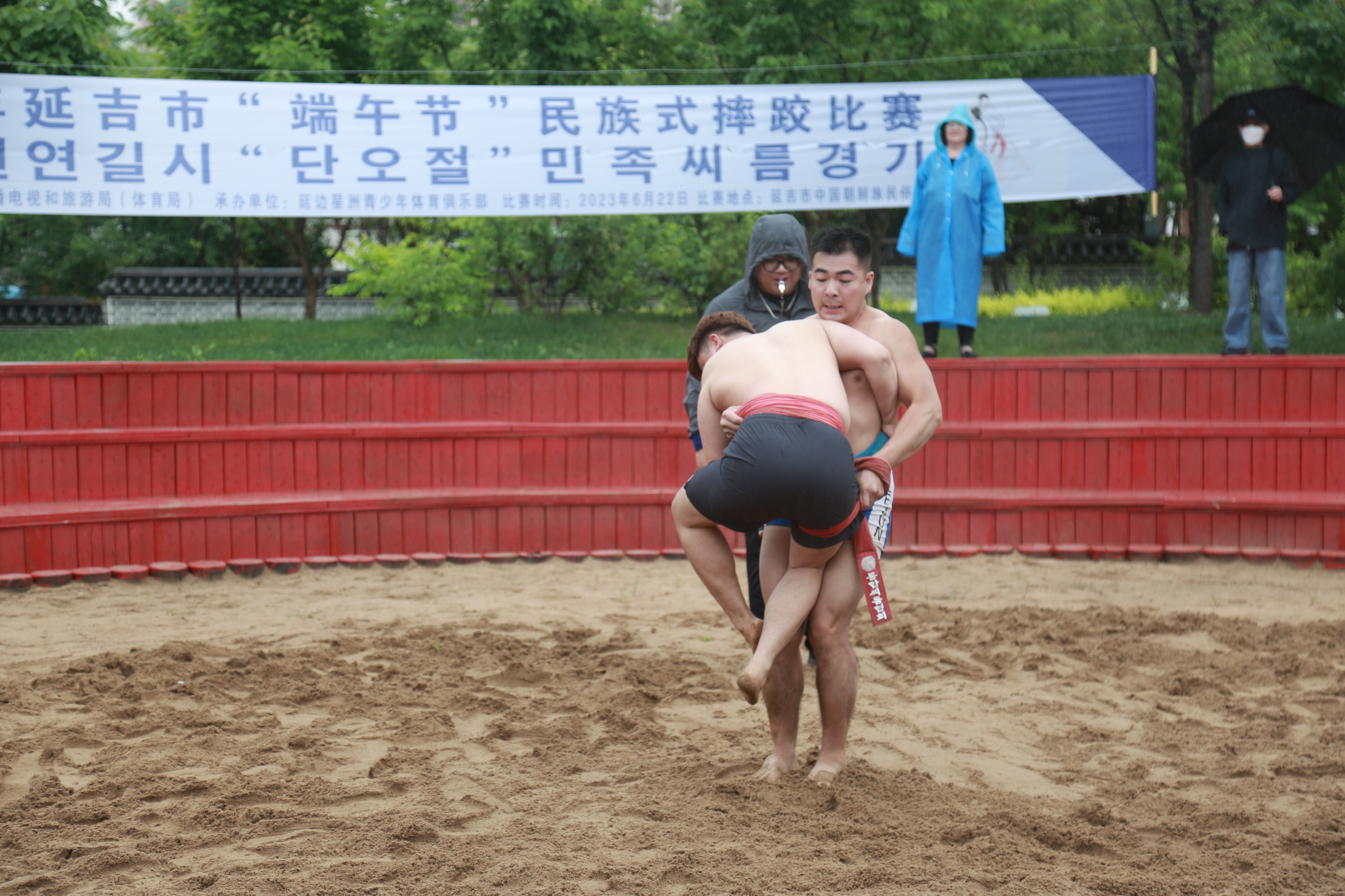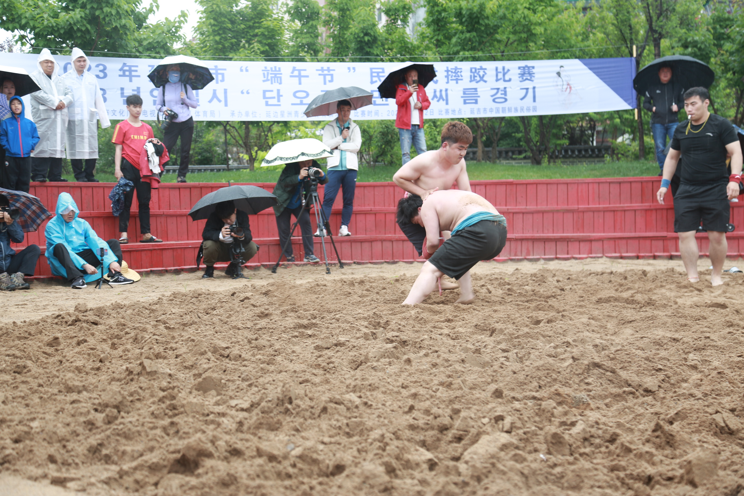 6月22日,在中国朝鲜族民俗园,2023年延吉“端午节”民族式摔跤比赛激情开赛,吸引了众多市民和游客观看。