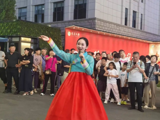 延边大学门前,“夏夜遇非遗·清爽游延边”歌舞展演每晚吸引着数万名市民游客驻足。活动将持续至9月3日,每日19:20-19:50与20:10-20:30由延边歌舞团及各县市文艺团体轮番献艺。 长鼓引领节奏,小锣清脆、大锣浑厚、圆鼓铿锵——四物乐交织出欢悦韵律;世界级非遗中国朝鲜族农乐舞(象帽舞)更是焦点,飘带翻飞如环似线,赢得阵阵喝彩。惊喜不止于表演:现场不定时派发的“畅游延边大礼包”,内含《五彩阿里郎》《四季如歌》等热门演出优惠票、中甲联赛球票及啤酒节代金券,点燃游客探索延边的热情。