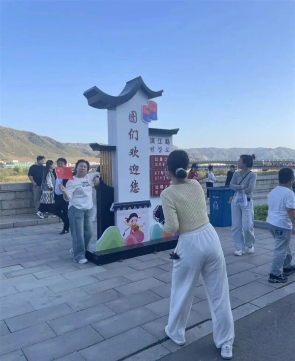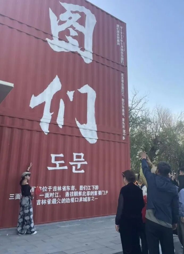 顺着人流来到中朝边境的图们江码头,游客身影随处可见:有人举着手机定格边境风光,有人驻足远眺感受江两岸景致,还有不少游客登上游船,沉浸式体验边境水域的独特风情。沿着网红打卡地八七街区向景区深处行进,不同年龄段的游客络绎不绝——年轻情侣并肩漫步,好友结伴说说笑笑,家庭游客带着老人孩子缓步前行。大家手持小国旗,在印有“图们”字样的打卡墙前轮番拍照,脸上洋溢着笑容,尽情沉醉在浓郁的边境旅游氛围里。
