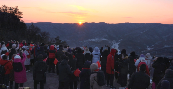 新年第一天的旅程从观日光山曙光开始。清晨6时30分,游客从老虎岭出发,沿“福满门”打卡点拾级而上,登顶日光山主峰观景平台共迎新年曙光,定格“日出图们”的壮丽瞬间。随后,在农乐表演的悠扬旋律中祈愿国泰民安、生活美满。8时整,新国门广场举行庄严的升国旗仪式,全体人员肃立高唱国歌,齐诵《歌唱祖国》,现场还赠送了文旅宣传手册与手写福字,让爱国情、民族情在边疆国门交融升华。