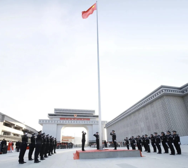 上午8时,在新国门广场举行升国旗仪式,雄壮的《义勇军进行曲》响彻广场,图们出入境边防检查站移民管理警察组成的国旗护卫队,护卫着五星红旗冉冉升起,飘扬在新国门上空。广大市民群众、游客们以及图们出入境边防检查站和图们边境管理大队的民警们肃立注目,齐唱《歌唱祖国》,以庄严方式开启新年。同时,现场还设有“翰墨纳福区”赠送“福”字,笔墨飘香间,一幅幅饱含新春祝福的“福”字被送到人们手中,为这场庄重的仪式增添了浓浓的年味儿与温暖气息。