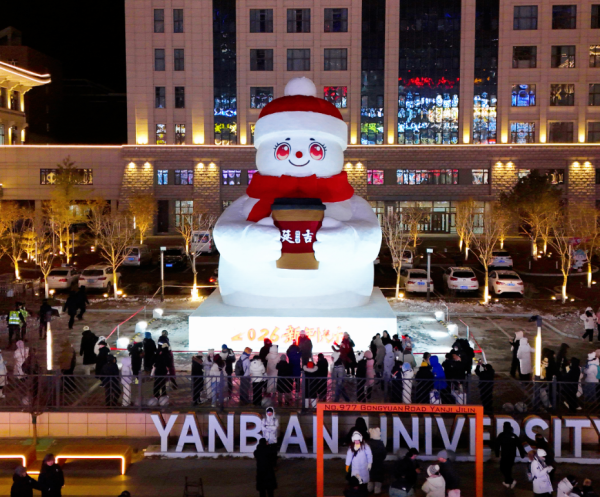 延边大学正门西侧则成为网红打卡新地标。2025年12月31日17时18分,超12米高的网红大雪人正式亮相,雪人手持印有“延吉”字样的咖啡杯,搭配红帽红围巾的喜庆装扮,成为城市跨年的标志性景观,也让“延吉”城市标识通过视觉符号深入人心。