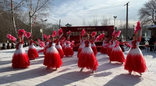 民俗展演闹新春,秧歌起舞年味浓。磨盘山村广场锣鼓喧天,500名表演者上演雪地秧歌展演。红绸翻飞、彩扇摇曳,表演者将关东秧歌粗犷豪放与汪清地方特色相融,整齐舞步、热情笑容尽显关东民俗鲜活魅力,营造祥和新年氛围。不少游客受氛围感染,主动加入扭秧歌队伍,沉浸式感受新春喜庆。