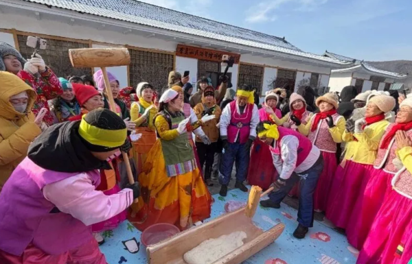 民俗小院暖人心,朝汉同心话温情。11时,“民俗小院融双韵 朝汉同心迎新年”活动在磨盘山村民俗馆开启。朝鲜族民俗体验区内,农乐舞展演鼓点铿锵,引得游客喝彩;打糕制作区,游客亲手捶打糯米体验传统乐趣;尤茨游戏区,众人围坐竞技,解锁朝鲜族传统游戏魅力。朝鲜族打糕、辣白菜搭配东北铁锅炖、酸菜炖粉条,风味交融,游客一站式品尝特色美食,深切感受民族同心温情。